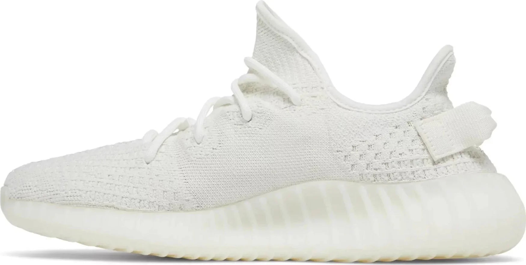 The adidas Yeezy Boost 350 V2 Bone showcases a triple white Primeknit upper, accented by mesh side stripes and canvas heel tabs. A semi-translucent Boost-cushioned sole delivers comfort and completes the minimalist look.