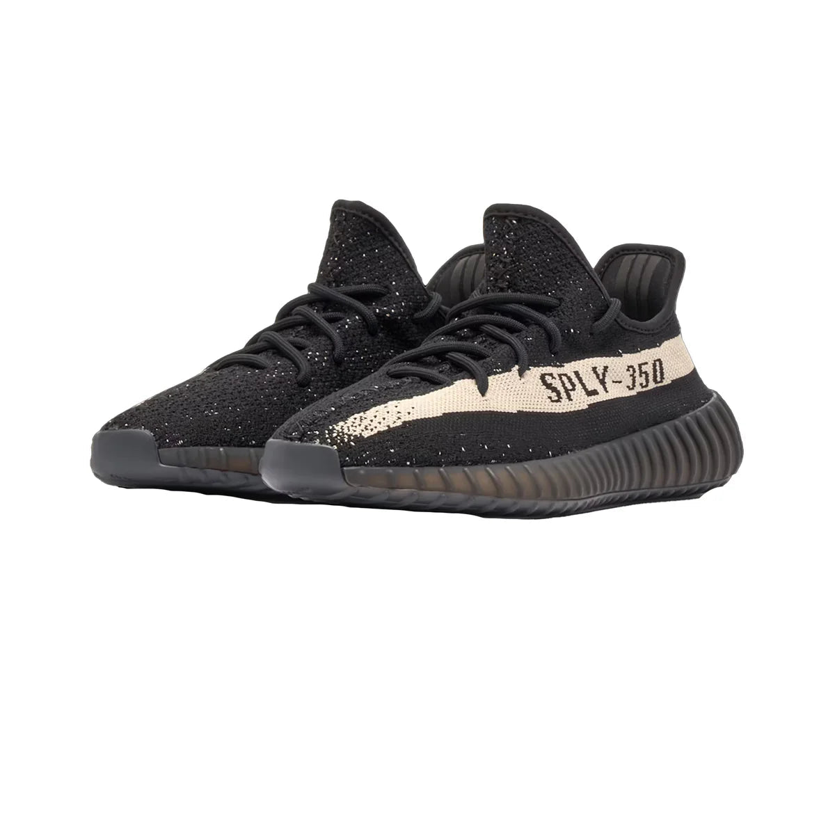 The adidas Yeezy Boost 350 V2 Core Black White features a black Primeknit upper with a cream side stripe and "SPLY-350" text, finished with a Boost-cushioned sole.
