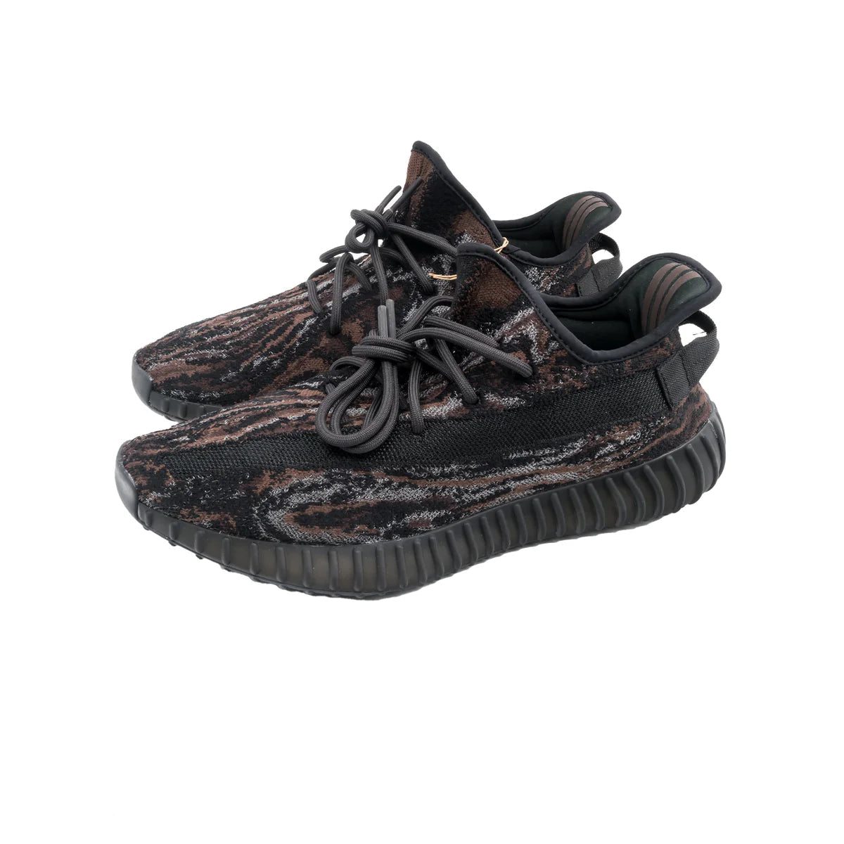 The adidas Yeezy Boost 350 V2 MX Rock sports a marbled mix of black, grey, and brown on its Primeknit upper, paired with a mesh side stripe, heel tab, and full-length Boost midsole for comfort.
