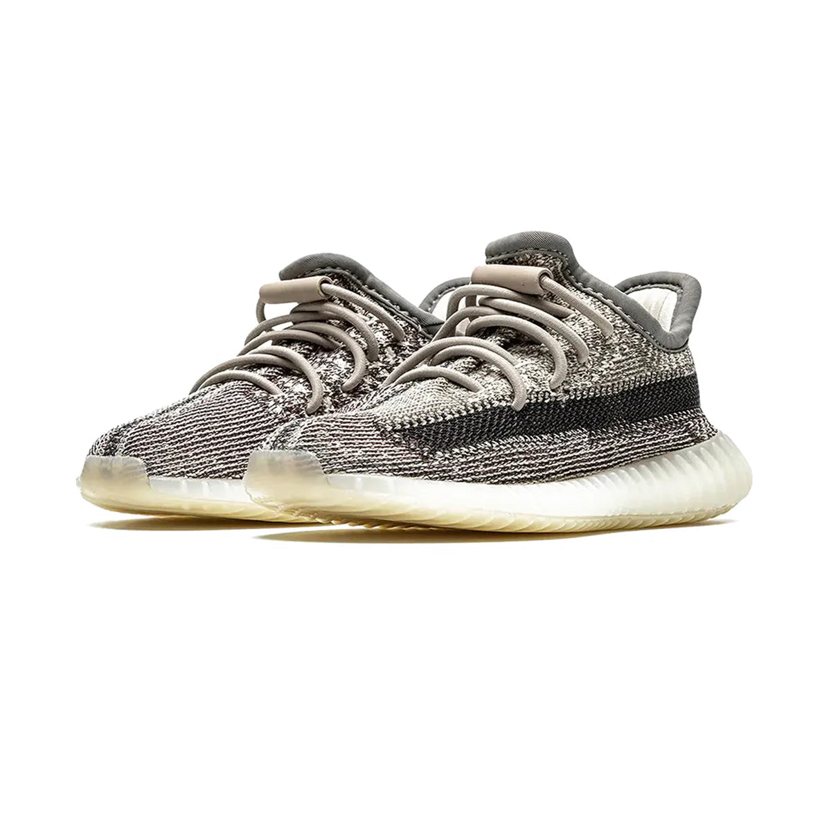 The adidas Yeezy Boost 350 V2 Zyon features a Zyon Primeknit upper with mocha tones and a dark brown side stripe, finished with a translucent Boost sole and cream interior.
