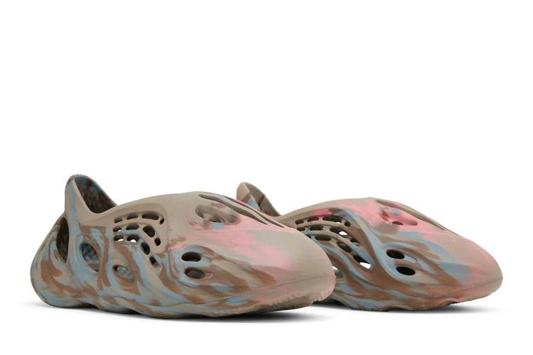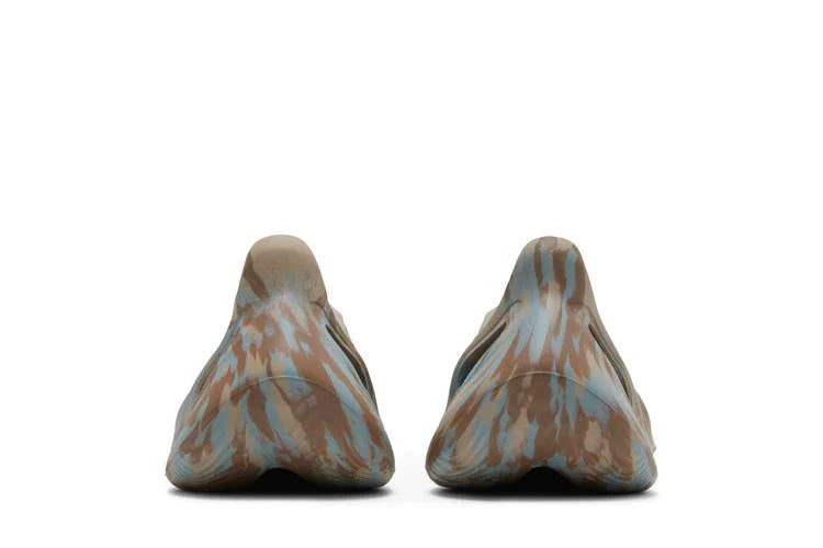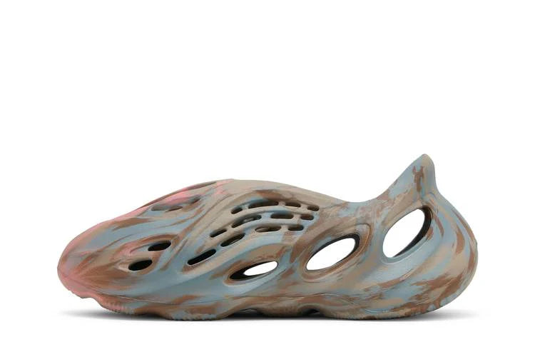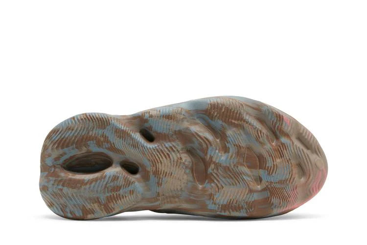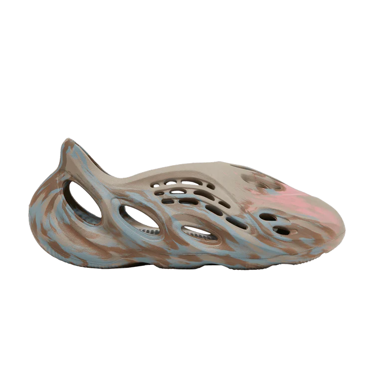 The adidas Yeezy Foam RNNR MX Sand Grey features a striking multicolor swirl design that blends beige, dark brown, and grey tones across its sculpted foam construction. The unique marbled pattern, reminiscent of paint mixing, ensures that no two pairs are exactly alike.